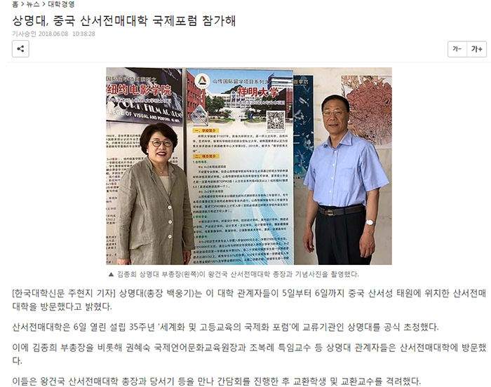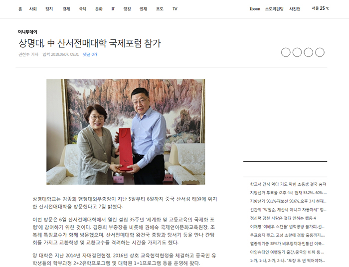 近日,韩国DAUM网站(韩国最大的门户网站之一)和한국대학신문(韩国大学新闻社)对我校与韩国祥明大学开展国际交流合作进行了宣传报道。